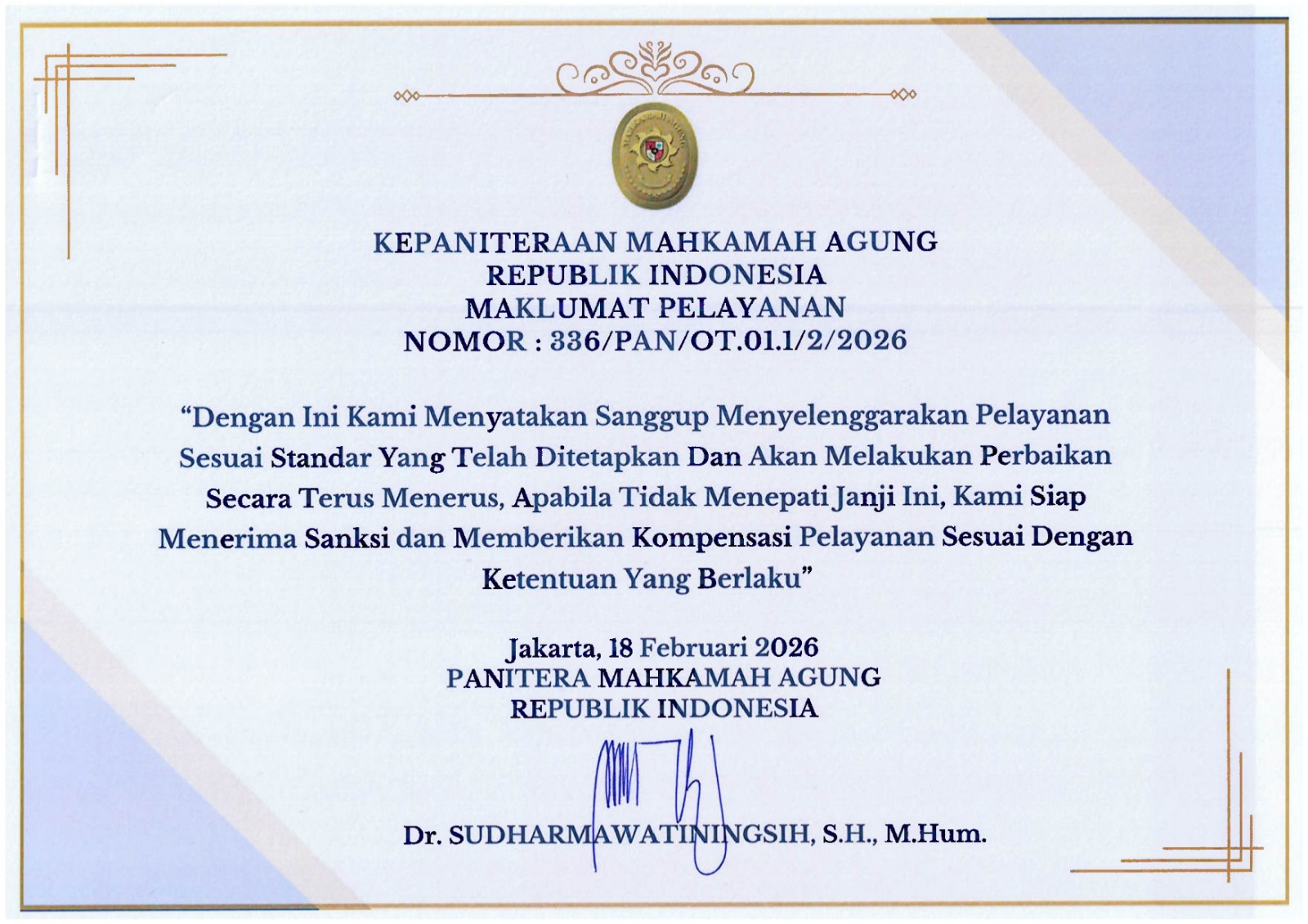 JAKARTA | (13/2/2026) - Ketua Mahkamah Agung, Sunarto, mengambil sumpah jabatan dan melantik Sudharmawatiningsih sebagai Panitera Mahkamah Agung, Jum’at (13/2/2026), bertempat di Ruang Kusumah Atmadja, Gedung MA, Jakarta. Pengangkatan Sudharmawatiningsih sebagai Panitera MA didasarkan pada Keputusan Presiden Nomor 4/M Tahun 2026 tanggal 9 Februari 2026. Sudharmawatiningsih yang sebelumnya menjabat sebagai Panitera Muda Pidana Khusus Mahkamah Agung sejak pelantikan tersebut resmi memimpin Kepaniteraan Mahkamah Agung, menggantikan pejabat sebelumnya, Heru Pramono, yang telah diangkat sebagai...